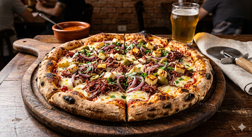 Molho de tomate, mussarela, carne do sol, queijo coalho, cebola e orégano
