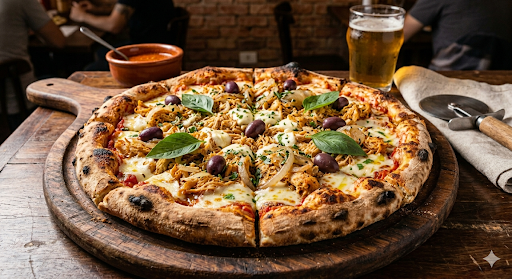 Molho de tomate, mussarela, frango, cebola e orégano