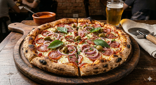 Molho de tomate, mussarela, calabresa, cebola e orégano