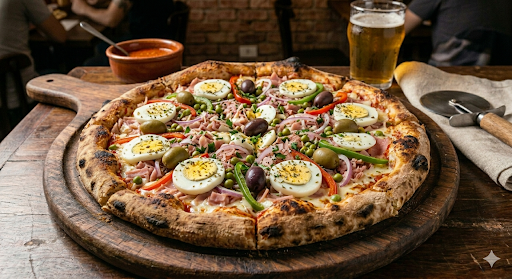 Molho, mussarela, presunto, pimentão, ovos, tomate, cebola e orégano